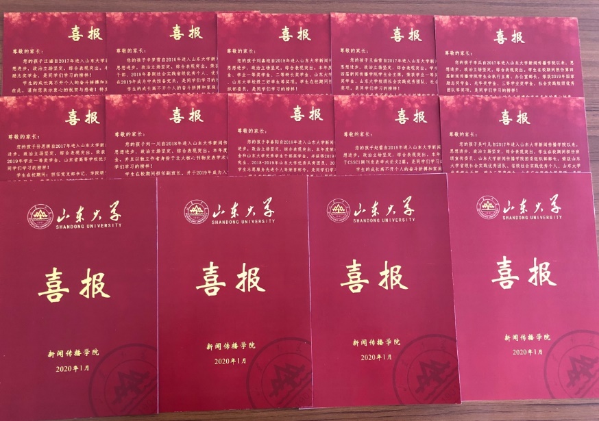 与此同时,为进一步做好寒假走访工作,增强学生的荣誉感,扩大激励效果,激发学习热情,加快构建学校、家庭、社会三位一体的育人体系。学院在12月底,启动了“喜报进家门”活动。向2019年度成绩优异,表现突出的优秀学子家庭寄送“喜报”。一张张红色的喜报,承载着学子刻苦学习的辛勤汗水,承载着学校和学院人才培养的累累硕果,目前,全部喜报已于1月9日全部寄出。