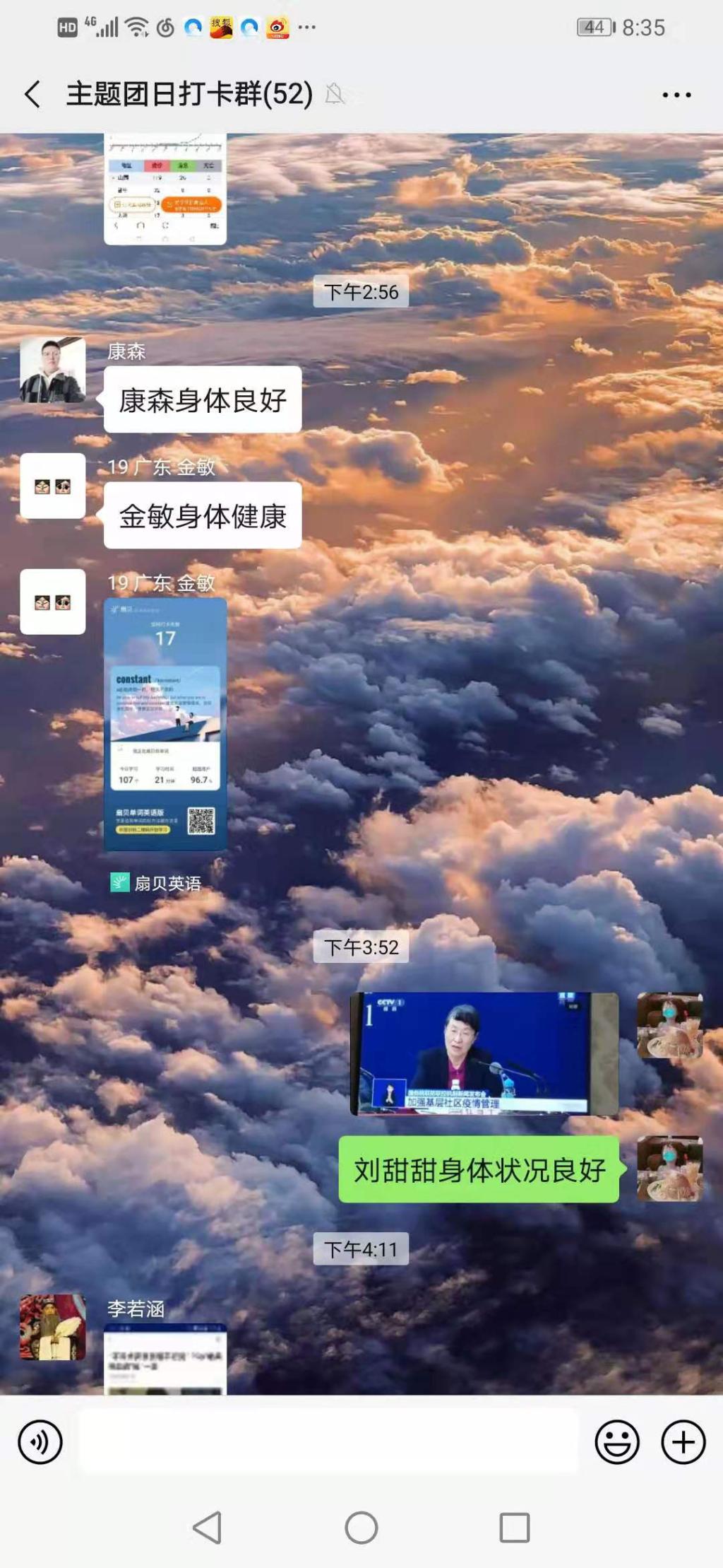 为引导学生合理安排假期时间,学院依托“山大新传说”公众号,积极发声,策划发布了“书影相随”读书活动,“疫情结束后你想做什么”创意文案活动。各支部均组织开展了丰富多彩的线上活动,同学们积极参加“自我提升计划”,选择每日读书、体育运动、背英语单词、观看经典电影、专业拓展学习、观看慕课等一个或多个板块,通过微信群打卡分享的形式参与,丰富充实了新传人的生活,让“宅家”的时间能被高效利用。