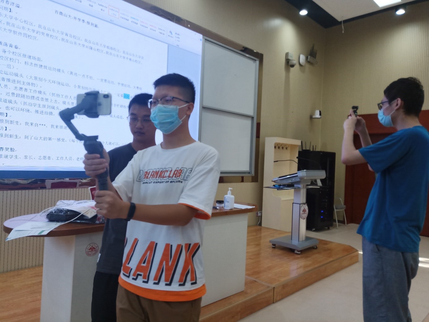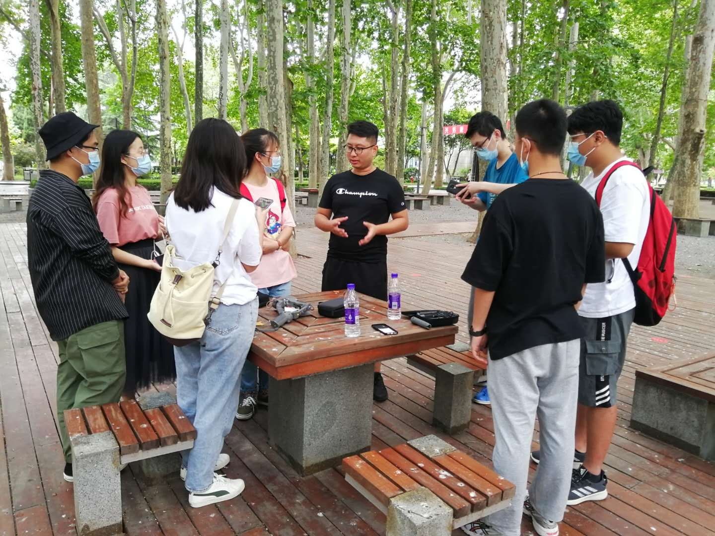 与以往不同的是,本次拍摄采用手机稳定器和口袋相机,因此为保证12号当天拍摄顺利进行,指导老师郭坦在9月10号、11号对影协成员进行了线下培训。9月10号下午2点至4点,郭坦老师和十名影协成员在101教室进行手机稳定器的操作练习。由于大家基本都是初次接触手机稳定器,郭老师和副会长周世勋从手机稳定器的功能键开始讲起,让成员们熟悉基础操作,然后再进行简单的运镜训练。9月11号下午4点到5点,郭老师将全部拍摄设备分发给成员们,并提醒成员们在使用手机稳定器时要注意一些细节,比如手机调平等。指导过后,成员们在小树林进行户外场景的拍摄练习,为明日的拍摄做好充足准备。
