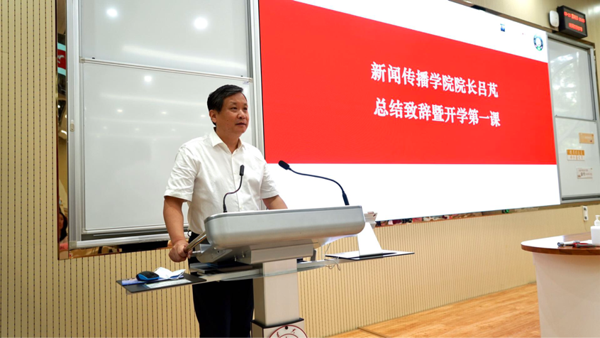 院长吕芃作了开学第一课讲话。吕芃表示,相比于本科生,研究生应该有更高层次的要求。研究生首先要有坚定的理想信念,坚定的政治理想和政治信念,学好习近平新时代中国特色社会主义思想,并将其作为自己行动的根本指南。要有明确的人生目标,明确自己的兴趣方向,学术追求和人生目标。要保持高度的新闻敏感,作为新传学子,要对时事热点保持更高的敏感度。要有扎实的学术功底,保持开阔的国际视野。要保持扎实的文字功底,勤于写作,锤炼自己的文字。要保持深刻的思辨能力,遇到问题多问几个为什么。思考新闻传播专业如何融入国家战略,思考我们的职责所在,把个人事业融入国家发展大势。最后,吕芃表达了对学生和家长学业顺利、生活幸福的美好祝愿。