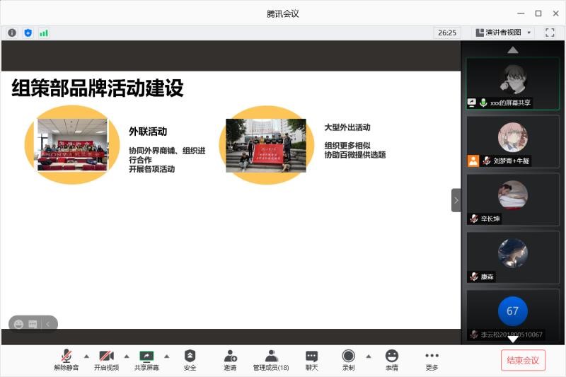 2020年09月20日下午7点,william威廉中文影视协会借助网络平台进行了对过去一学年的总结会议暨换届面试。活动的主要内容包括各部门的总结和对新成员的面试。共有20余名来自不同专业和年级的同学参加了本次活动。