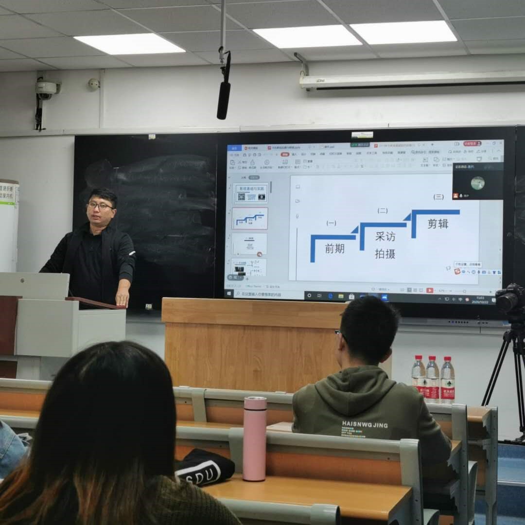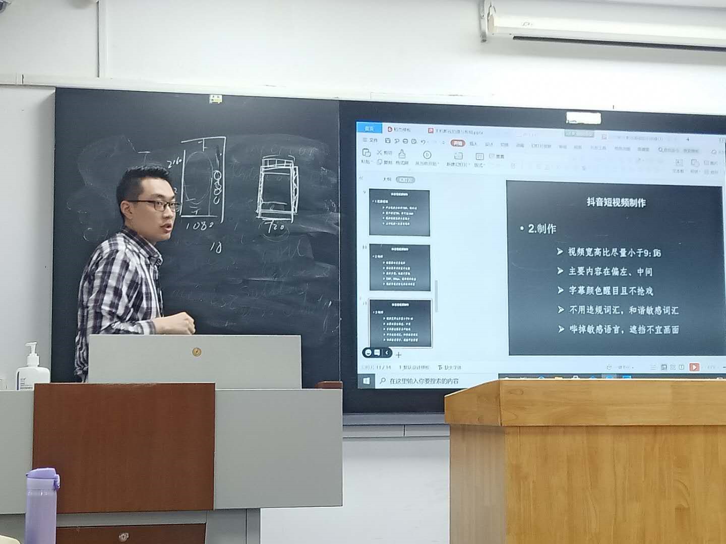 大道之行抖音运营总监陈鑫池老师则为大家讲解了有关新媒体运营方面的知识。陈老师通过讲解抖音账号的制作流程及规范,以及分享运营的成功案例,让同学们对新媒体运营有了更深刻的了解。