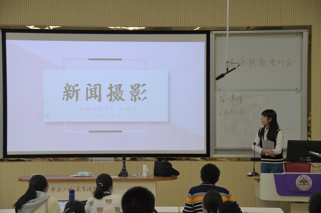 在新闻创作浅析模块,杨璐围绕新闻的基本概念和理解,新闻的基本结构及新闻写作的具体方法和要求,为同学们进行了讲解和示范,有助于提升学院学生干部的新闻素养,并推动学院新闻报道工作的规范化,专业化建设。