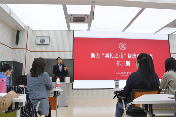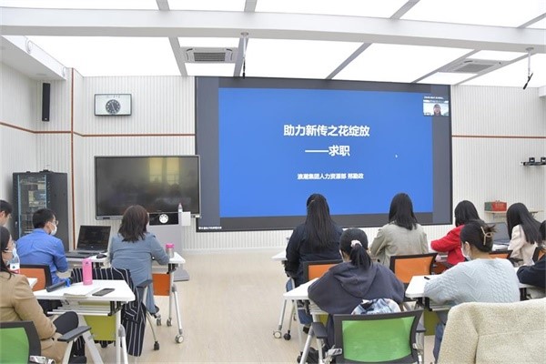 在职场专业人士分享环节,活动采用了以线上与线下相结合的形式开展。来自山东英才学院的董事长助理何志辉先生,结合自己在多个企业高管的经历,在现场与同学们进行交流。他首先向同学们分析了当前环境下的职场现状,表示当今时代是个不确定的时代、创业的时代、数字化的时代,面对企业需求与高等教育培养的不对称问题,提出了自己的见解,勉励同学们要终身学习。他向大家讲述了四个典型榜样,提出了“思路决定出路,布局决定结局”的人生道理。最后,他对同学们给予了真诚的建议:要专注自己,关怀他人,理解世界,努力提升自己。要“以未来牵引现在,以现在支撑未来;以外在的成长性面对未来的不连续性;以内在的确定性面对未来的不确定性”,分享内容令现场的学生收获良多。