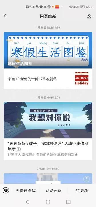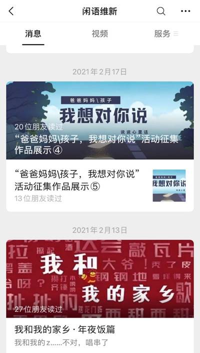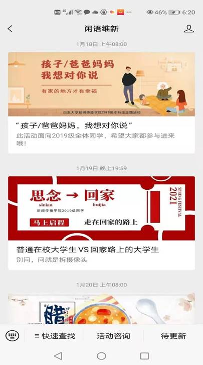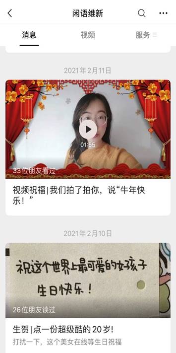 班主任侯滢老师和辅导员许玉莲老师共同指导的年级公众号“闲语维新”创建于2020年9月。作为2019级本科生校园学习生活的展示平台,立志于记录青春、见证时光、引领向上向好,专注新闻专业实践,寒假期间该微信公众号的育人作用发挥更加凸显。据统计,寒假期间“闲语维新”公众号共推出22篇推文,平均两天一篇的“新鲜出炉”,内容涵盖学习、生活、娱乐、社会实践等多个方面,既展示同学们的假期生活,又督促大家共同进步。