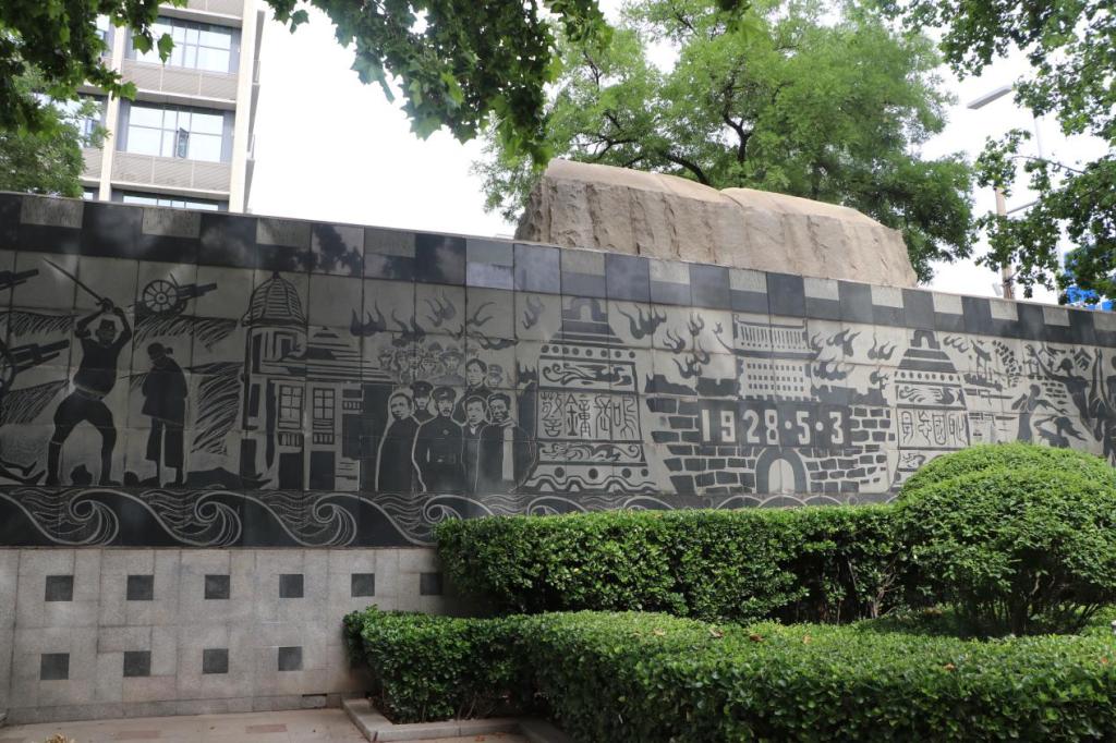 参观伊始,实践团队来到了“五三街”,“五三街”原名顺城街,是济南人民于1929年5月为了纪念“济南惨案”更名而成,以志不忘民族之恨。步入“五三街”,映入眼帘的是“济南惨案纪念碑”,日历形状的石碑的正面以文字的形式详细记载了惨案发生的过程,背面以壁画的形式记载了侵略者的残忍行为,简单的文字与图画记载的是中华民族无法忘却的历史,记载的是济南人民无法抹去的伤痛。