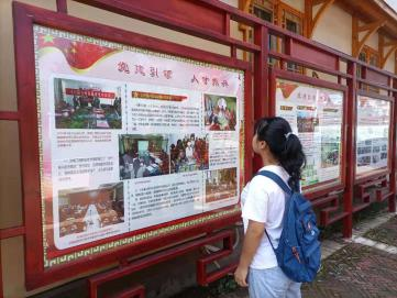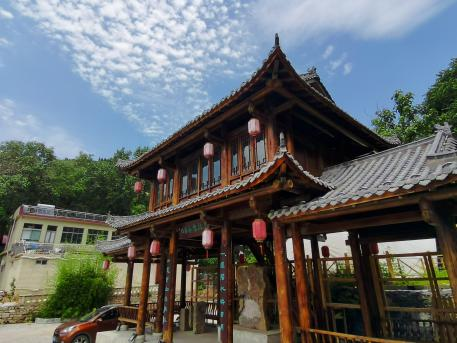 白云与山鸟齐飞,清泉共碧空一色。一下车,村口的一面写有“黄鹿泉村”的指示牌便在蓝天掩映下进入队员们的视线,对面古色古香的白色牌坊上笔走龙蛇的写着“黄鹿泉村优品街”几个大字;成员们走入村中,映入眼帘的是富有中国传统文化特色的民居,其间雕梁画栋,处处可见乡村振兴战略的宣传标语;路边设有垃圾分类收集厅,并设置了管理人员信息公示栏,整洁的环境倒映在一片碧水蓝天中,更显魅力无穷;村口不远处的老年服务中心传来阵阵欢声笑语,劳作归来的村民脸上汗珠点点,呼朋引伴,倍显欢愉。整洁的村容村貌、稳定的收入来源、幸福的村民生活······在基层党组织的带领和村民的共同努力之下,黄鹿泉村在短短几年间打了个漂亮的翻身仗。
