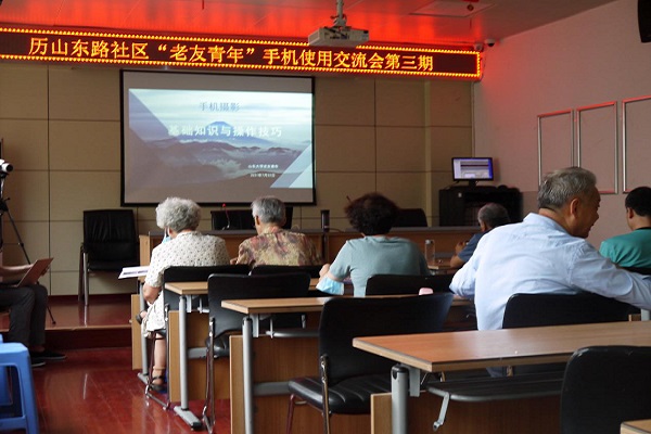 7月22日上午,威廉williamhill“老友青年”社会实践团队来到济南历山东路社区例行为老年人们开展交流会,本次交流会的主题是手机摄影及图片编辑基本技巧。考虑到老年人们对于手机的熟悉程度有所不同,山大老友青年团队特意限制活动参与人数,有针对性地满足不同老人的个性化需要。活动旨在帮助老年群体更好地利用手机作为摄影工具记录生活的美好。