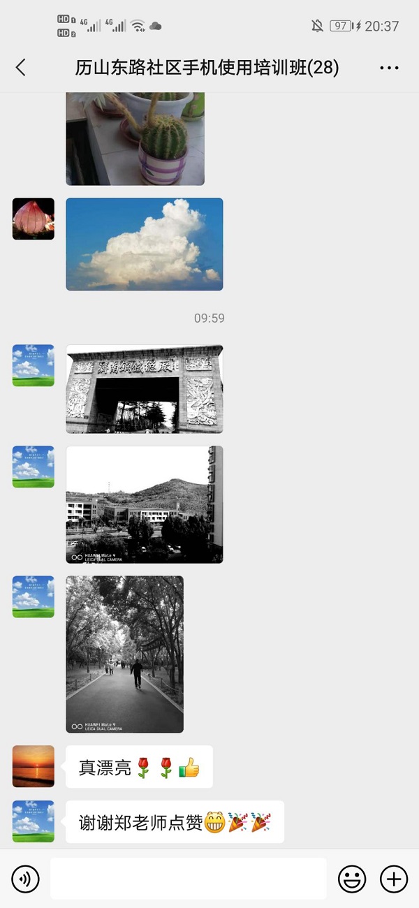 大家兴致很高,在一片欢乐的气氛中,志愿者开始与老人进行一对一的交流。老人们有的在试着拍照,有的在给自己之前拍的照片加文字、加滤镜。有不少老人将照片发到了群里进行分享。比如,一位刚退休的爷爷说,今天讲的给他解决了很多以前没解决的问题,“自己操作老是有很多细节的地方弄不明白。哎,你们今天一讲,一操作,都能解决了!”这位爷爷在群里分享了很多自己之前拍的照片和编辑过的图片,收获了一众点赞。