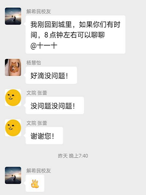 经过本次对解希民校友的采访,寻访首都筑梦山大人队的成员们都敬佩于前辈的优秀,同时通过细心聆听校友的回答,解开了个人成长过程中的一些困惑、坚定了学习方向、对职业发展与选择有了更清晰的认知。除此之外,队员们还和校友建立了友好关系,立志不断汲取前人的力量,砥砺前行!