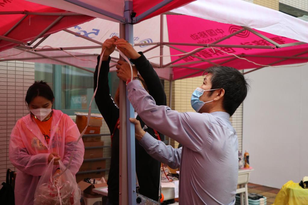 (党员先锋岗志愿者搬运防雨物资)