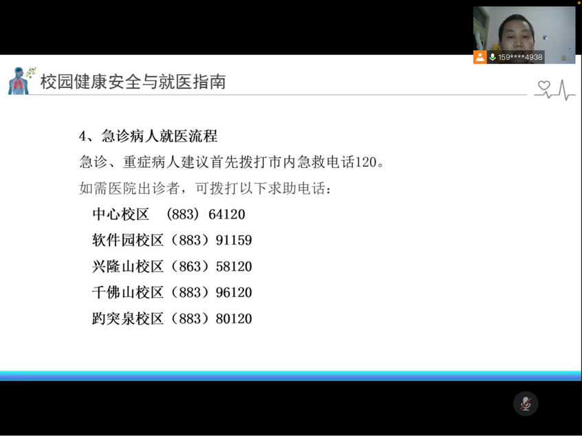 当天晚上,校医院为我院研究生新生开展了卫生健康教育。校医院郭加兴老师从新冠肺炎与新冠病毒疫苗、疫情常态化防控下的应急处置、校园常见传染病防控措施、近视防治与用眼卫生、意外伤害与应急救护、校园安全与就医指南等方面普及了校园健康卫生常识,为我院师生提升卫生健康意识、加强疫情常态化管理提供了专业指导。