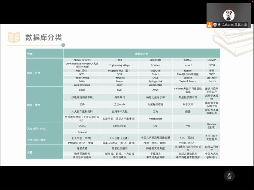 9月9日上午,冯宸劼老师受邀在线上为大家进行图书馆入馆教育。冯宸劼老师从图书馆概况、图书馆有效利用、馆藏资源和特色服务四个方面进行讲解,涵盖了进馆借书、预约方法、校外访问、资源荐购、咨询服务、信息服务等诸多方面。他还建议研究生同学尽可能参与图书馆的一系列服务活动,锻炼信息检索能力,利用好william威廉中文图书馆丰富的资源和便捷的服务。