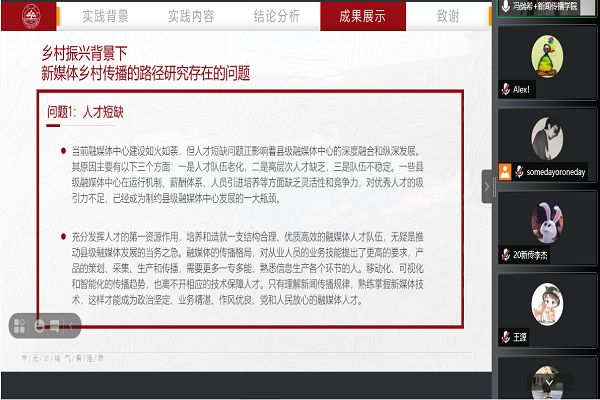 本次答辩会上,13支社会实践答辩队伍依次对本团队的实践经过与实践成果进行了汇报与展示。每支队伍答辩时间严格限定,评审团的各位老师和同学们对各支答辩队伍进行了评审、提问与打分。各团队表现形式多种多样,每支队伍各有所长,或主题新颖深刻,或讲解过程简洁明晰,抑或实践成果丰硕。各团队调研主题涉及了红色文化、党史宣讲、老龄化探究等多个方面;展出形式丰富多样,除文字、照片等传统形式外,多个团队以纪录片、短视频的形式展示调研成果。