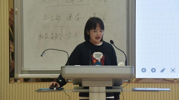 随后学术科创部代表董雨姝进行上一学年的工作总结,分享了学术科创部在上个学年完成的活动,如组织辩论队纳新赛、助力新传之花活动、保研考研分享活动、迎新纳新活动等。随后提出了工作规划,部门将继续开展辩论赛、组织考研保研分享会等,最后她介绍了新成员,并希望新成员们能够在这里提高自身能力,收获一段美好的回忆。