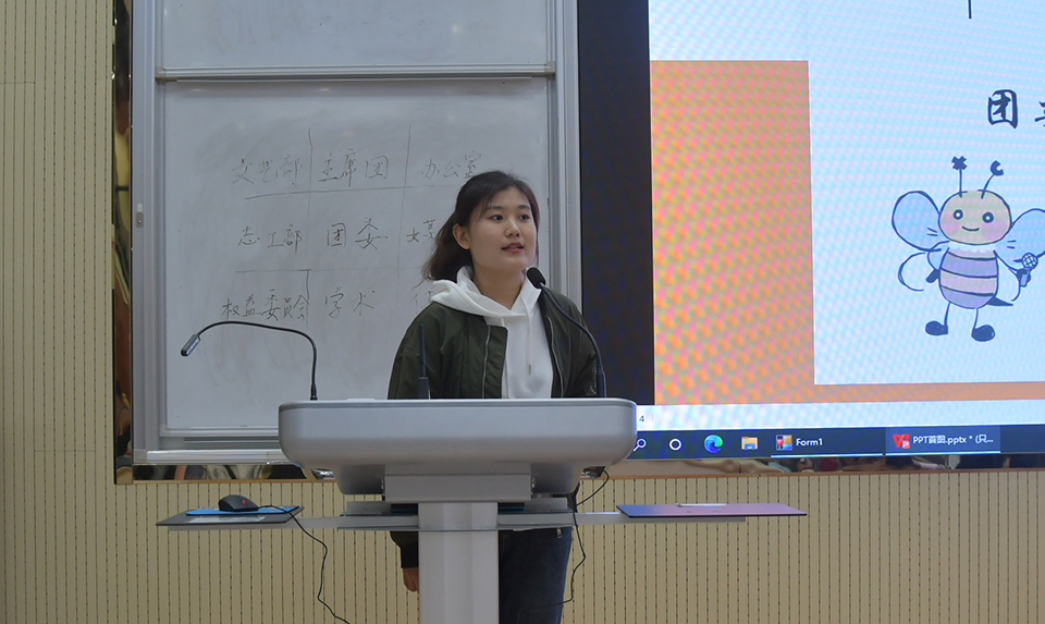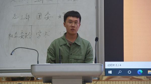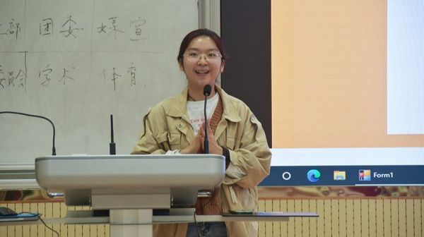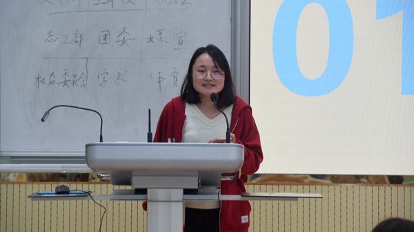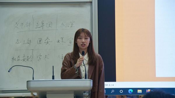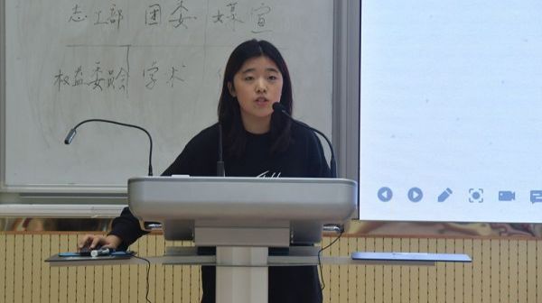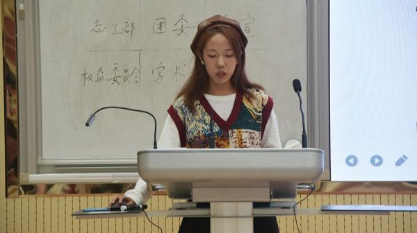 志工部代表崔育宁首先进行了工作总结,分享了志工部在上个学年开展的活动,包括宿舍文化节、衣物捐赠等,随后介绍了新一学年的工作规划,如联系相关人员开展志愿活动等,最后崔育宁热烈欢迎了加入志工部的新同学。