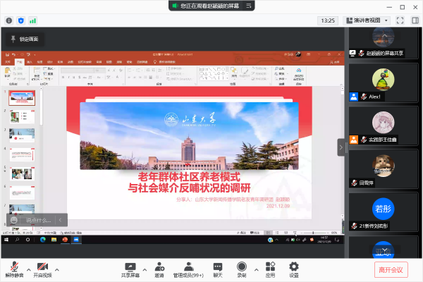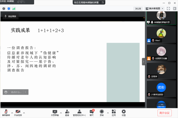 主持人王佳鑫对我院今年获奖的社会实践团队与个人进行名单宣读。随后进行了社会实践优秀团队及个人经验分享环节。“老友青年社会实践分队”立足于当今社会老龄化现象,开展了面向社区老人的智能手机操作教学等相关服务工作。团队分享人赵颖颖从多个角度讲述了一支优秀团队应该具备的能力,为大家呈现了实践中存在的问题与克服的重重困难。“用新守护,共赴康健”分队,讲述了在山东、江苏和天津四地展开实地调研,帮助老年人拥抱互联网时代的健康生活的活动情况。该团队通过问卷调查和访谈的形式,了解老年人网络健康信息搜寻行为的现状,并进行了老年人个体健康现状的调查,为践行健康中国战略贡献出了青年力量。