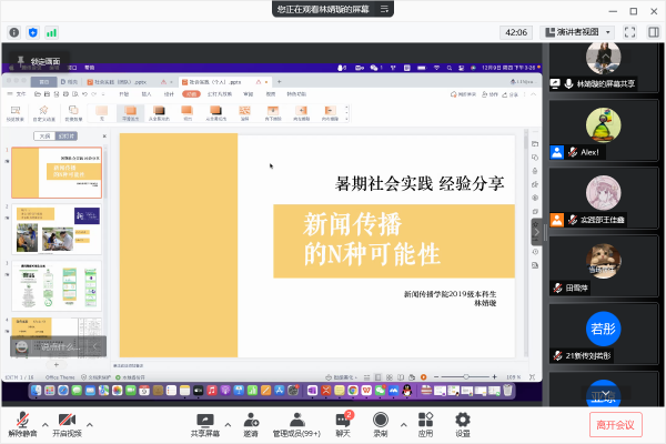 社会实践先进个人代表林婧璇作社会实践经验分享。林婧璇重点介绍了自己在社会实践团队中的工作,如何在多项实践活动中做好协调。林婧璇作为共赴康健团队的负责人,统筹协调各项工作,在项目操控、细节把握、内容宣发等各方面进行了全方位、多角度、深层次的介绍,为学弟学妹们指明了未来社会实践的谋划方向。
