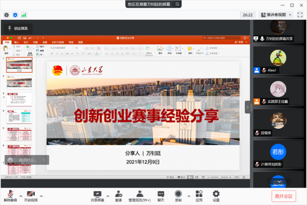 会议进行到第三个环节,主持人宣读了2021年威廉williamhill在双创大赛中的获奖团队名单,三只优秀团队进行经验分享。