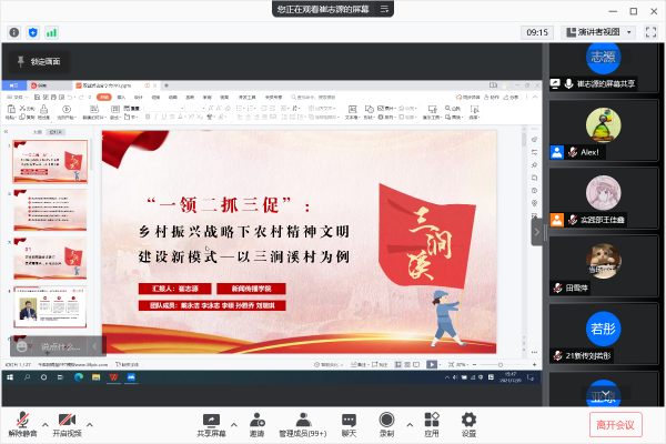 挑战杯优秀团队“三涧溪”负责人崔志源分享了乡村振兴战略下农村精神文明建设新模式团队的成果。他们以全国文明村三涧溪村为调研对象,深入基层、实地考察,全面了解三涧溪村的精神文明建设的基本情况,梳理了三涧溪村精神文明建设的举措和成效,将其归纳总结为具有普遍性、可推广性的“一领二抓三促”模式,并对农村精神文明建设提出策略思考。