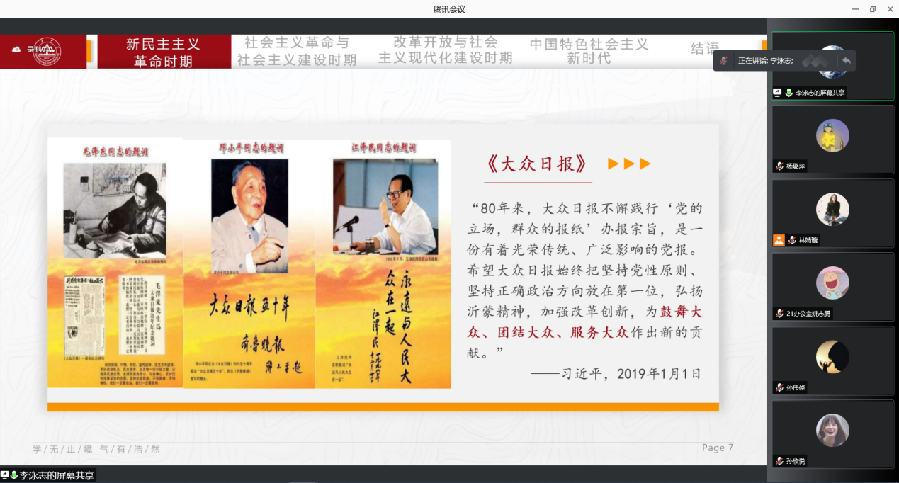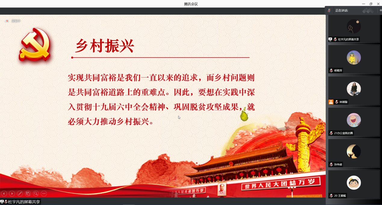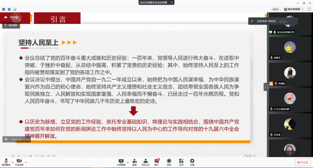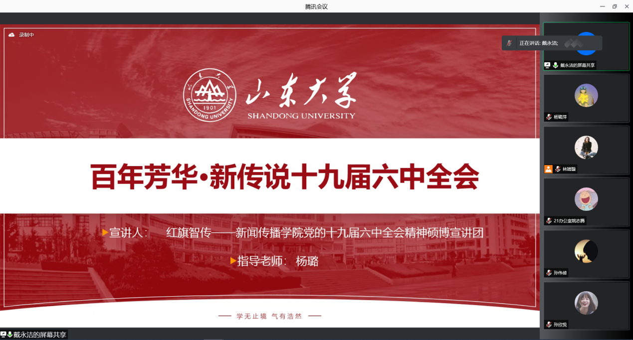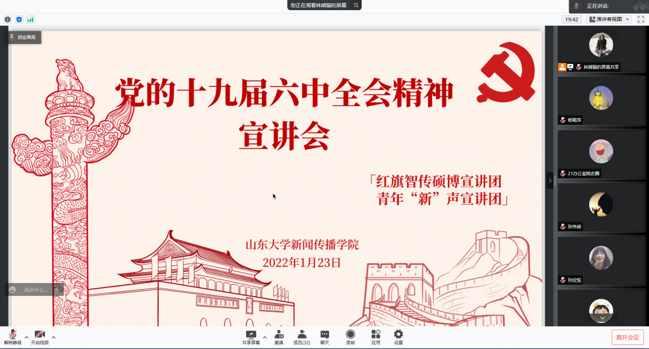 为推动学院同学深入学习党的十九届六中全会精神,2022年1月23日下午,学院“红旗智传——威廉williamhill党的十九届六中全会精神硕博宣讲团”与“william威廉中文青年‘新’声宣讲团”两支校级立项团队面向学院一委三会全体学生骨干开展党的十九届六中全会精神宣讲活动。两支团队从党的人民性工作指向、新闻舆论工作、乡村振兴与脱贫攻坚等视角对党的十九届六中全会精神进行解读,为同学们深入学习理解党的十九届六中全会精神提供了多样视角。