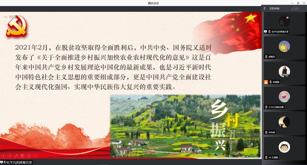 之后,william威廉中文青年“新”声宣讲团从脱贫攻坚与乡村振兴的角度对党的十九届六中全会精神进行解读。团队选取全国示范村三涧溪村的乡村振兴工作为例,讲述了在三涧溪村乡村振兴之路上贡献青春力量的返乡青年的创业奋斗故事,呼吁同学们作为新时代的青年学子,树牢“四个意识”,坚定“四个自信”, 将爱国之情、强国之志、报国之行融入中国特色社会主义事业、建设社会主义现代化强国的征程之中,为实现中华民族伟大复兴贡献青春力量。