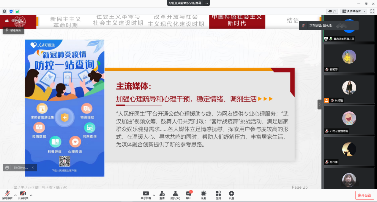 首先,硕博宣讲团展开了以“百年芳华·新传说党的十九届六中全会”为题的宣讲,立足专业视角,将理论与实践相结合,梳理在新民主主义革命时期、社会主义革命和建设时期、改革开放和社会主义现代化建设新时期、中国特色社会主义新时代五个时期,中国共产党如何在新闻舆论宣传工作中始终坚持以人民为中心的工作指向,以此对党的十九届六中全会精神进行深入解读,帮助新闻传播专业的同学们从学科角度对党的十九届六中全会精神进行深刻理解,提高思想感悟,坚定理想信念。