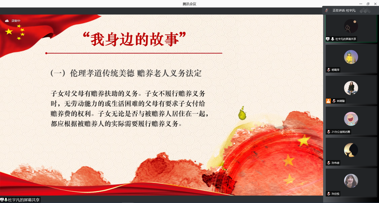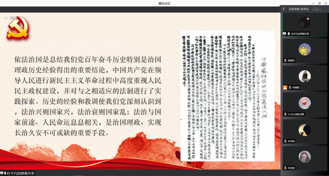 最后,宣讲团队带领同学们对党全面依法治国的历史成就的总结进行集体学习,深入贯彻学习了习近平法治思想。法治兴则国家兴,法治衰则国家乱。法治与国家前途、人民命运息息相关,是治国理政、实现长治久安不可或缺的重要手段。