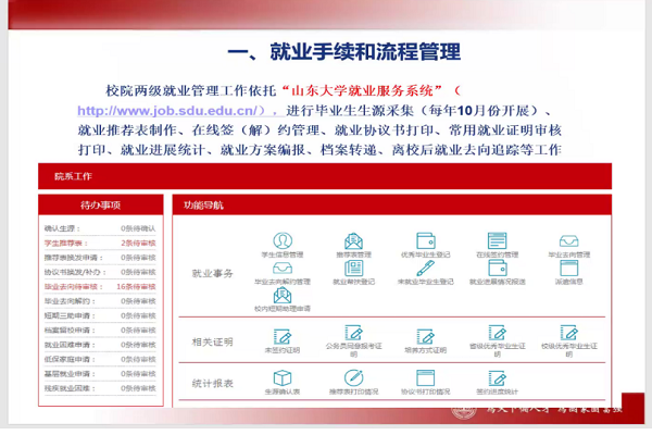 会议开始,杨璐首先展示和说明了毕业生毕业手续与就业登记注意事项,逐步讲解确认生源信息、就业推荐表制作、在线签(解)约管理、就业协议书打印、常用就业证明审核等一系列流程,指导学生操作就业系统,并推动学生尽快落实就业去向登记。针对不同学生的毕业去向及其所需证明材料,杨璐也分类型进行说明和重点强调,并提出下一阶段要积极响应学校开展的“一生一策”帮扶指导,调查摸排、精准帮扶重点群体毕业生尽早就业。