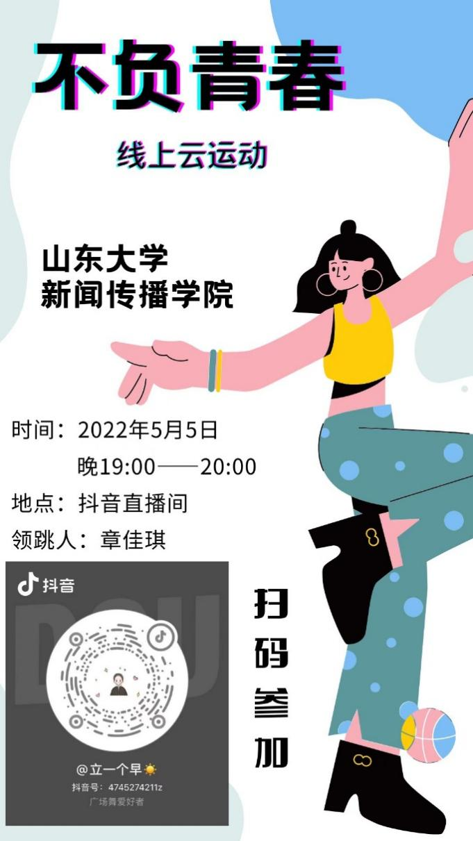线上云运动预计于每日19:00在章佳琪同学的抖音直播间准时开播。隔离生活中,健康排首位,均衡饮食、规律作息的同时也要多多运动,在汗水中感受自律的快乐!今天缺席的你,明天快来加入吧!