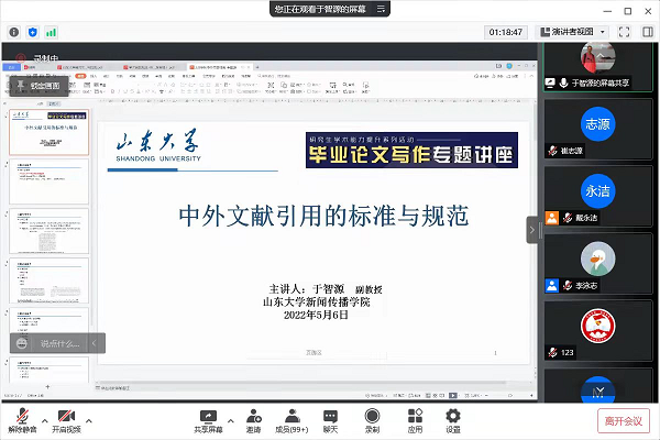 于智源副教授分享了“中外文献引用的标准与规范”。他从为什么引用文献、如何引用文献、引用的形式与标记四个方面展开讲解。在明确文献引用的重要性和意义的基础上,他举例说明了引用的分类和具体应用。他谈到,文献引用要言之有物、事实确凿,做到多读好文献,读一手文献,边读边思考,找到研究的源头和自己研究的兴趣点;文献综述引用坚持“开门见山”“一网打尽”“穿针引线”的原则,注重创新;文献引用需要注意避免无中生有、移花接木、囫囵吞枣、照单全收等误区。此外,他还带领同学们学习了《学术出版规范——期刊学术不端行为界定》文件,提示同学们遵守学术规范,避免学术不端行为。