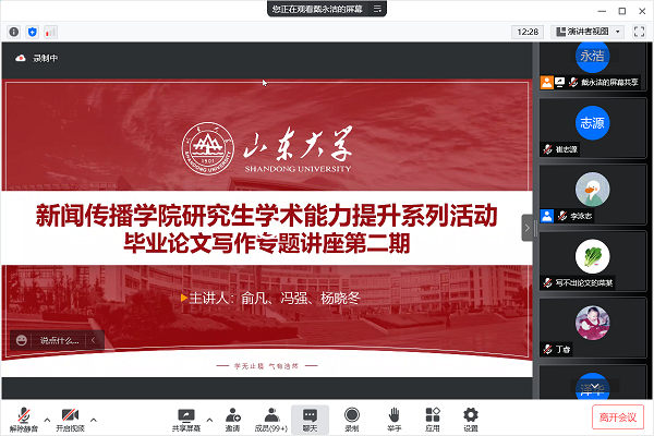 5月7日晚,由威廉williamhill团委、2020级硕士生党支部和学院研究生会联合主办的研究生学术能力提升系列活动之毕业论文写作第二期专题讲座举行,学院副院长、新媒体系系主任杨晓冬副教授,学院新闻系系主任俞凡教授,学院传播系系主任冯强副教授在腾讯会议上开讲,传授同学们毕业论文开题的重点内容与相关经验。讲座由2020级硕士生李泳志主持,200余名学生参加。