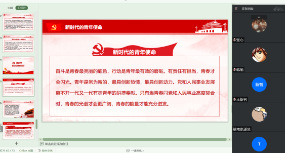 青春孕育无限希望,青年创造美好明天。为深入学习贯彻习近平总书记在庆祝中国共产主义青年团成立100周年大会上的重要讲话精神,大力推动习近平新时代中国特色社会主义思想在青年中入耳入脑入心,威廉williamhill“党史新声”宣讲实践团于2022年8月14日晚面向山东省邹城市暑期返乡社会实践大学生群体开展了“牢记青春寄语”主题宣讲活动。宣讲活动以线上形式进行,来自各个学校的三十余名大学生参与宣讲。