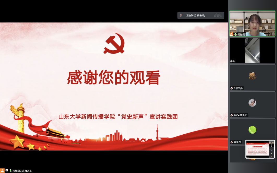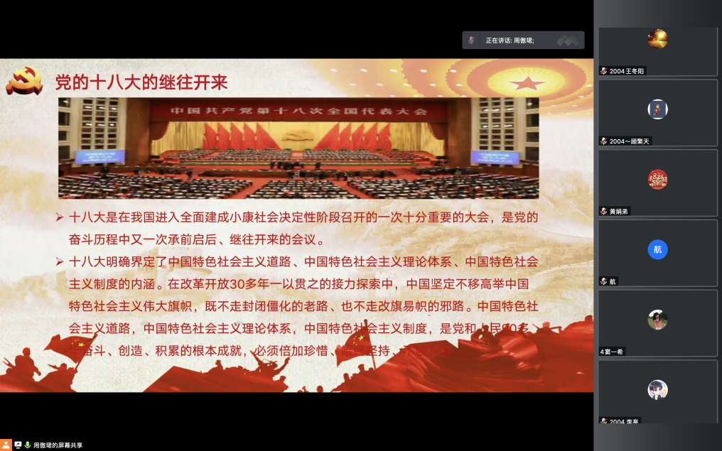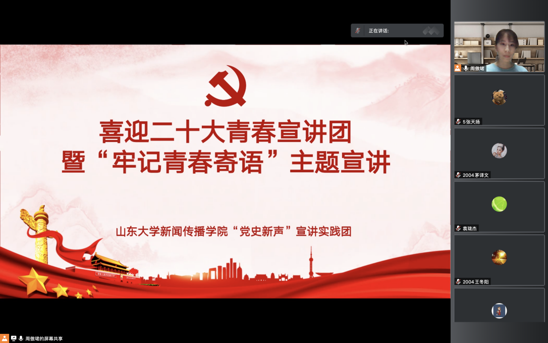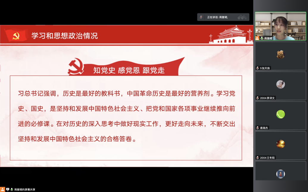 最后,周傲珺以新时代的青年使命这一主题为结尾,引用习近平总书记说的“一个时代有一个时代的主题,一代青年有一代青年的使命”,激励大家为中华民族伟大复兴不断奋斗,贡献青春力量。