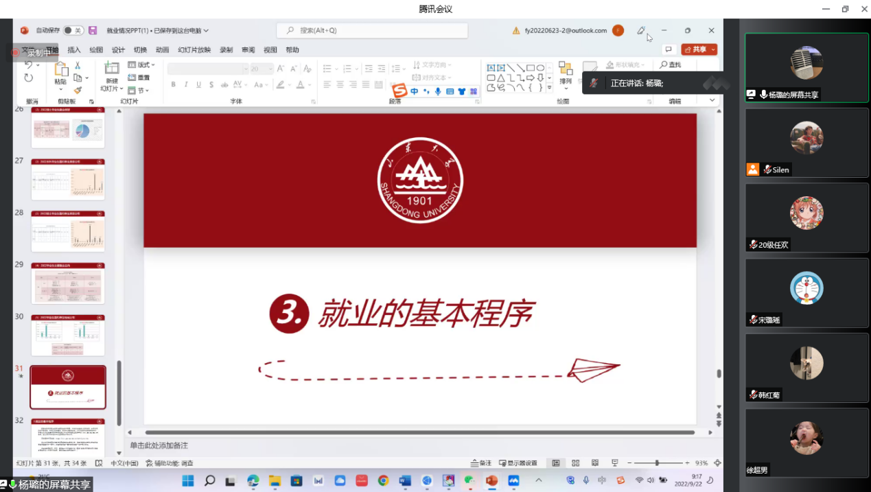 会议开始,杨璐围绕就业问题开展讲解。首先,他对本学院的就业情况、就业类型、签约单位等方面进行了简要梳理与分析。他表示,新闻传播专业就业面广,同学们的选择多样化,就业率保持在相对良好的状态。其次,杨璐向全体同学介绍了就业签约的基本程序,根据不同毕业生的不同就业选择,对材料准备、应聘、签约等环节进行了说明。其中,对于应届毕业生的理解、三方协议签署等同学们关心的问题进行了重点讲述。他提醒大家要正确看待应届生身份,积极就业,在签署三方协议时切记要维护好自身的权益。会议中,杨璐向大家介绍了就业信息的寻找路径,并演示了学校就业管理服务系统的操作流程。杨璐提醒同学们,要及时查看学院和学校为大家提供的就业信息,珍惜秋招的机会。最后,他结合自身经历,向大家介绍了简历制作的技巧和重点事项,鼓励大家结合自身条件,尽可能的丰富简历内容,增强简历与岗位之间的匹配度。