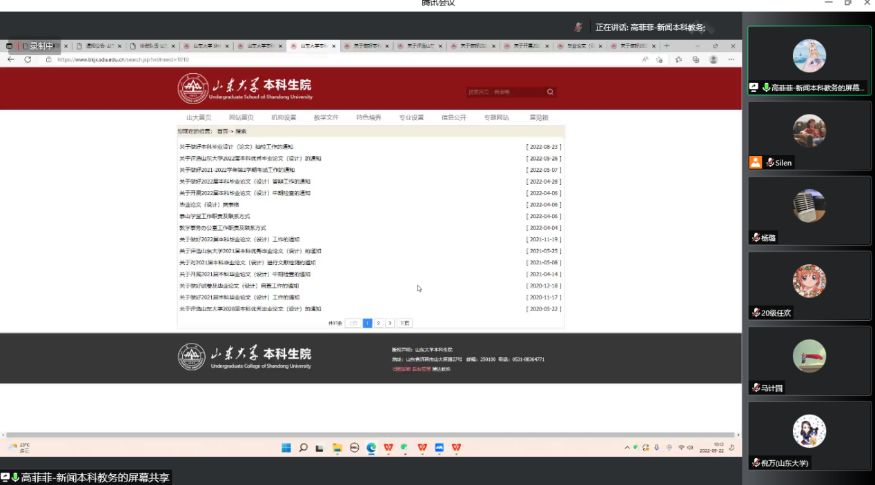 接下来,本科教务高菲菲老师围绕本科生的实习与毕业论文开展进行讲解。在实习方面,她重点强调了把控时间的重要性,要结合学院实习要求与自身实际,按时按点、保质保量地完成实习任务,以免耽误后续毕业的相关事宜。在毕业论文开展方面,高菲菲参照以往的通知要求,提醒同学们密切注意毕业论文的写作、提交、查重的具体要求,尤其是相关环节的截止时间。她强调,对于2019级的毕业生同学来说,时间并不是特别充裕,要合理利用时间,尽可能提前完成好论文写作,以保证后期不慌乱,有充足时间进行调整。