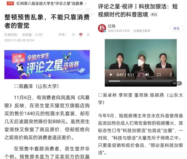 红网第八届全国大学生“评论之星”选拔赛已于2022年10月1日正式启动,面向全国所有高校大学生征集参赛作品。截至目前,我院2020级本科生已在红辣椒平台发表评论作品136篇,其中文字评论87篇、漫画评论17篇、视频评论31篇,作品被光明网、环球网、新浪新闻、搜狐网、网易新闻、腾讯网、中国青年报、中国经济网等媒体转发推广。