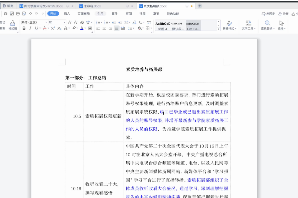 随后,团委各部门进行了本学期的工作总结。组织部代表许雯总结了上学期青年大学习流程优化与工作、团情考察、专题学习活动录入等工作,下学期组织部也将继续在五四评比、团支部“达标升级”等方面持续发力。宣传部代表董雨姝梳理了过去一学期稿件处理、毕业宣传、任务评选等学院对内外宣传工作,并指出未来在稿件投递方面的改进和发展方向。素质拓展培养部代表冯健坤回顾了素质拓展权限更新、组织党的二十大观看、修订素质拓展文献等方面的工作表现,并从素质拓展培养系统录入、社会实践立项、成仿吾英才班三方面对部门工作进行了下一步规划。文艺与创新部代表冯柯按重点介绍了社会实践和创新创业大赛分享会两大方面,呈现了组织优秀创新创业团队和个人的宣讲、撰写相关推文等工作的成效。实践部部长周长瑞提出在上学期社会实践成果上的两个重大突破,并表示实践部已做好寒假社会实践的计划,将继续在社会实践方面为同学们保驾护航。