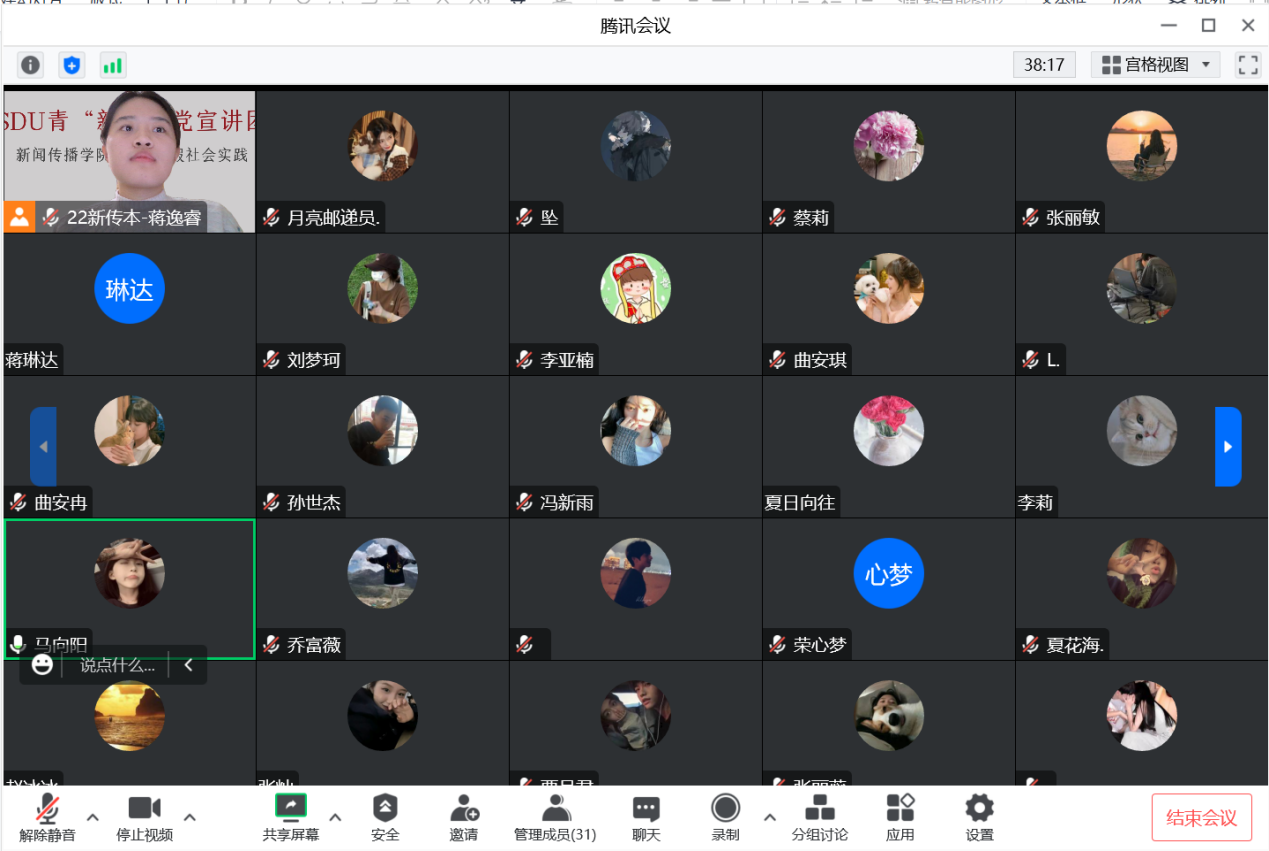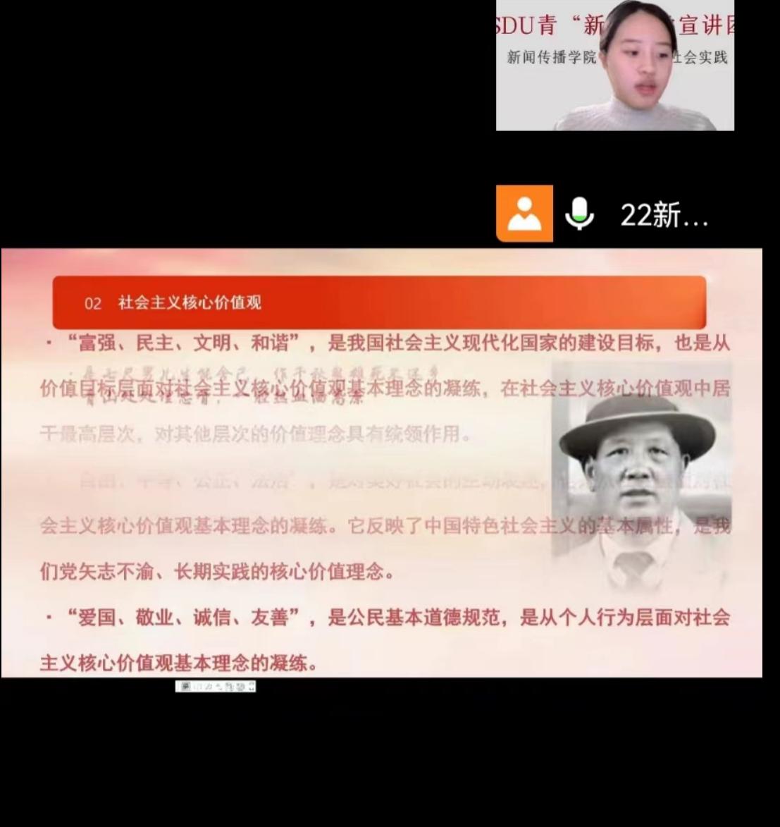 为深入学习宣传贯彻党的二十大精神,做好寒假社会实践,1月11日晚,威廉williamhill“青新向党”学生宣讲团成员蒋逸睿,通过腾讯会议线上方式,面向山东省聊城市技师学院22级会计专业的学生进行党的二十大精神宣讲。