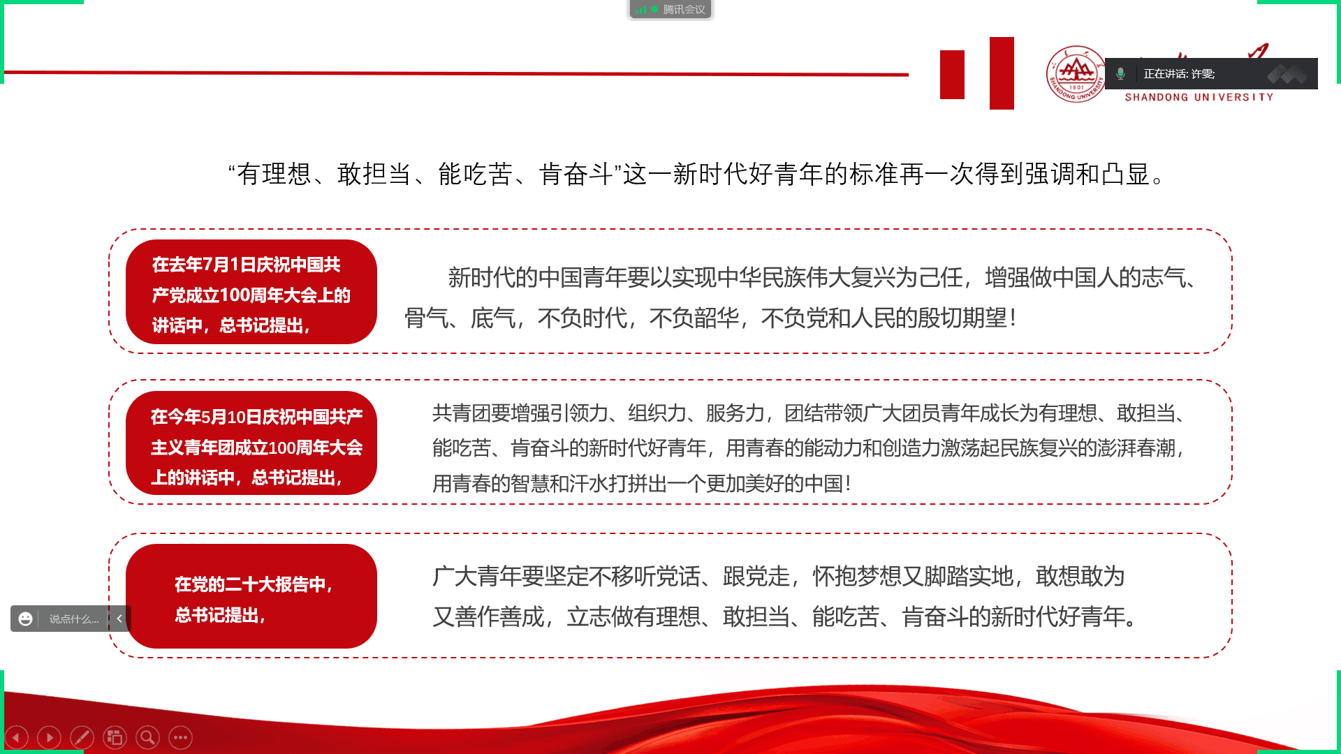 随后许雯带领大家聚焦党的二十大,重新倾听那些直抵人心的青年之音。习近平总书记在党的二十大报告中强调,当代中国青年生逢其时,施展才干的舞台无比广阔,实现梦想的前景无比光明。全党要把青年工作作为战略性工作来抓,用党的科学理论武装青年,用党的初心使命感召青年,做青年朋友的知心人、青年工作的热心人、青年群众的引路人。广大青年要坚定不移听党话、跟党走,怀抱梦想又脚踏实地,敢想敢为又善作善成,立志做有理想、敢担当、能吃苦、肯奋斗的新时代好青年,让青春在全面建设社会主义现代化国家的火热实践中绽放绚丽之花。