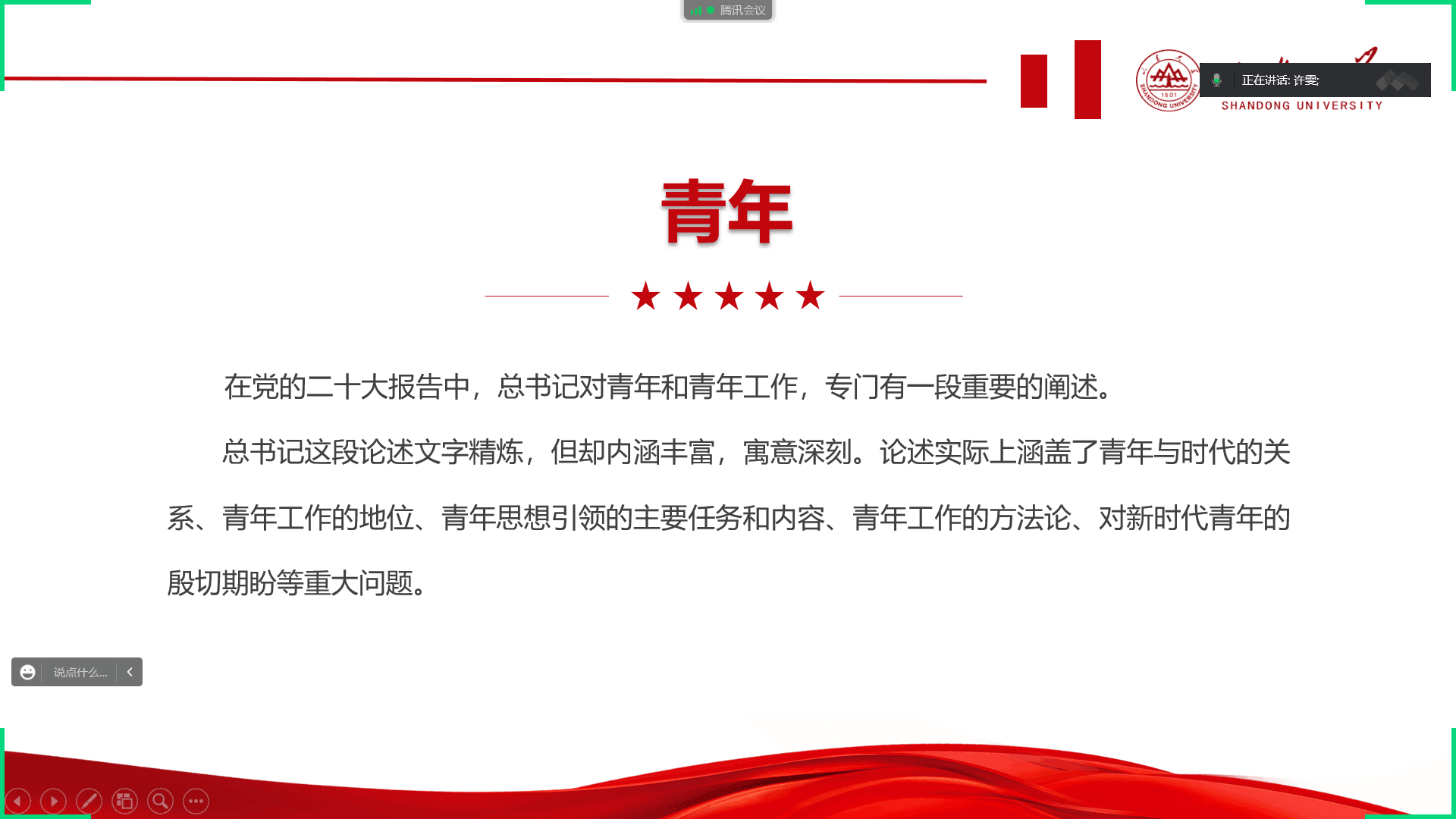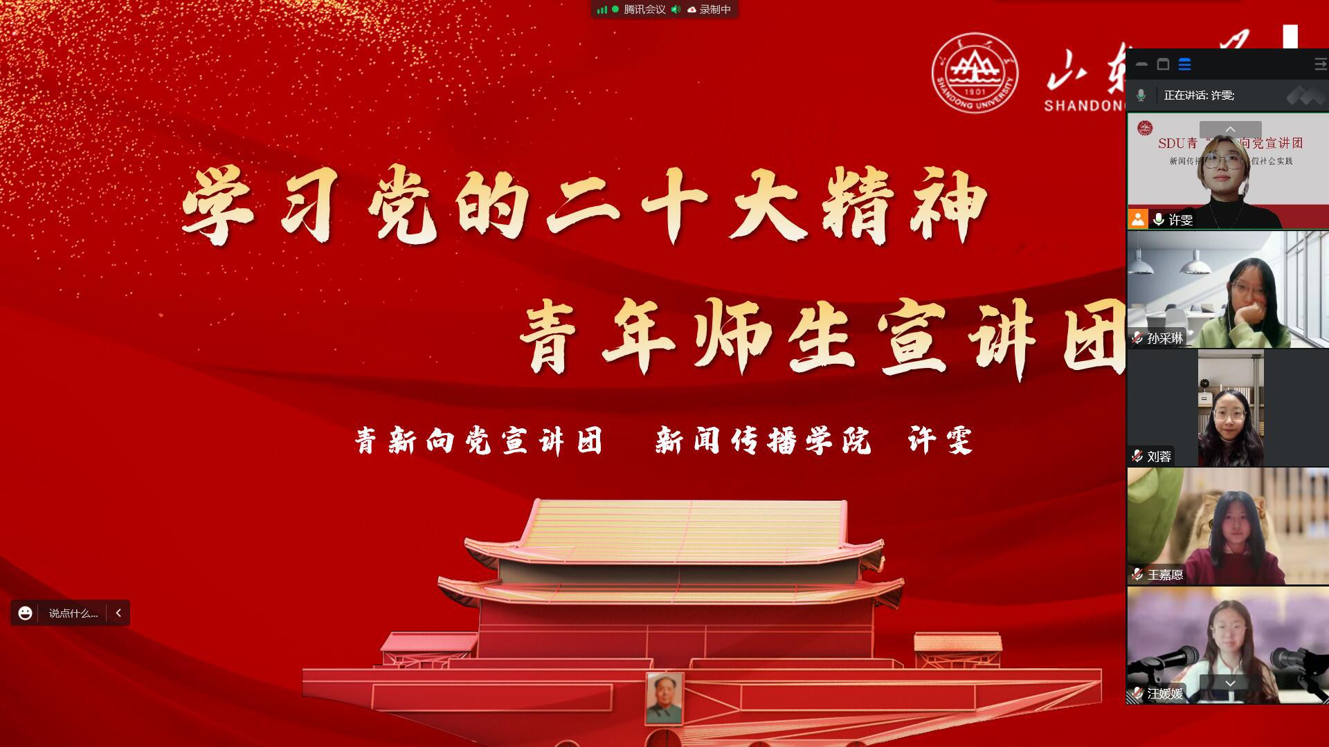 为进一步深入学习宣传贯彻党的二十大精神,让青年们在学习中砥砺初心使命,汲取奋进力量,1月16日晚上,威廉williamhill“青新向党”学生宣讲团成员许雯,通过腾讯会议的方式,在山东威海向山东临沂支教团队进行宣讲。此次宣讲以“奋斗新时代,青春正当时”为主题,许雯结合党的二十大报告中有关青年的内容,围绕新时代新思想、新成都新实践,讲述新青年新奋斗的生动故事。