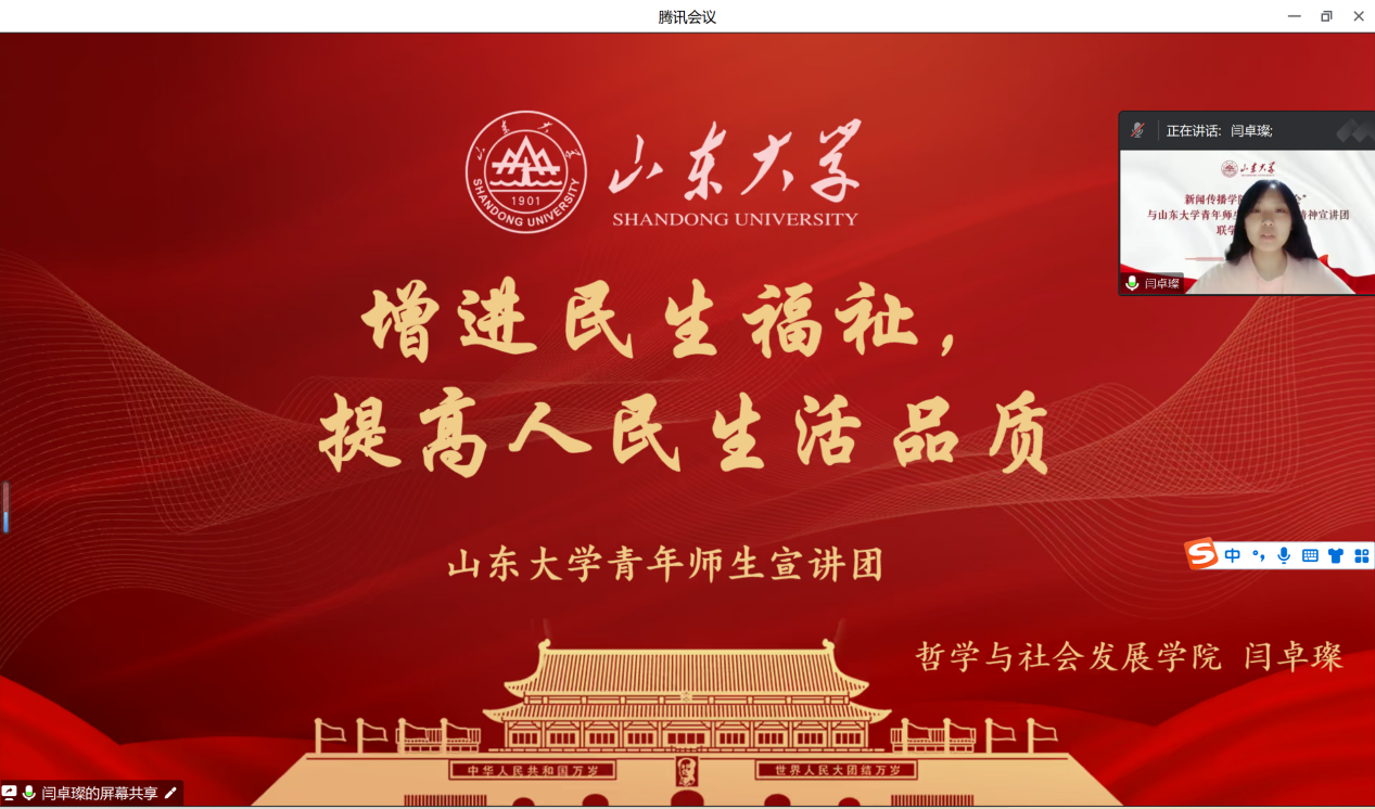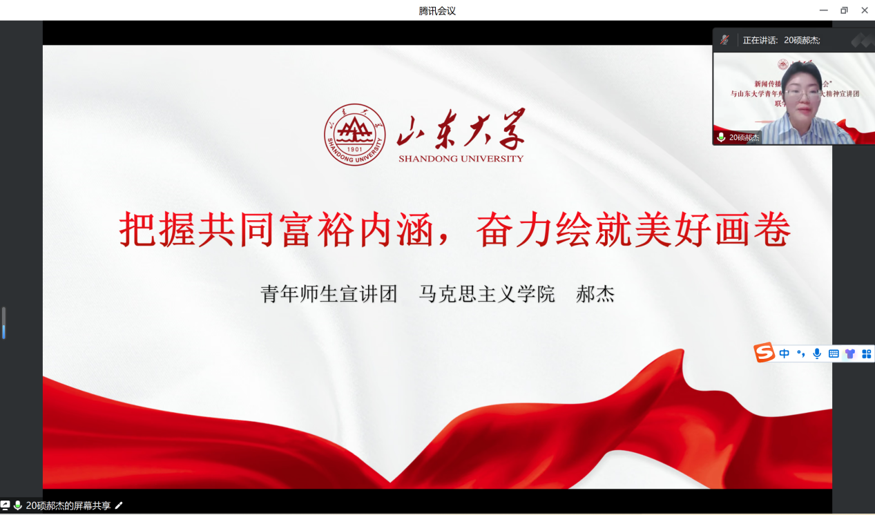 随后,william威廉中文党的二十大精神青年师生宣讲团成员刘晨曦、郝杰、杨家鑫、闫卓璨分别围绕文化自信、共同富裕、经济高质量发展以及民生建设等主题与同学们进行分享。宣讲团成员、威廉williamhill2021级硕士研究生刘晨曦为大家全面解读了党的二十大报告中关于文化自信的重要论述,介绍了新时代十年文化建设的伟大实践以及william威廉中文过去十年文化建设成就;马克思主义学院2020级硕士研究生郝杰带领大家学习了我国共同富裕理念的产生和发展以及共同富裕中“共同”的丰富内涵;经济学院2020级本科生杨家鑫从“经济高质量发展”“扩大内需战略”“深化供给侧结构性改革”等方面出发,结合自身专业知识,阐述了“深刻把握扩大内需战略与深化供给侧结构性改革有机结合,推进经济高质量发展”这一主题;最后,哲学与社会发展学院2021级本科生闫卓璨为大家介绍了我国增进民生福祉的重大举措以及新时代十年的民生建设伟大成就,人民群众获得感、幸福感、安全感更加充实、更有保障、更可持续。