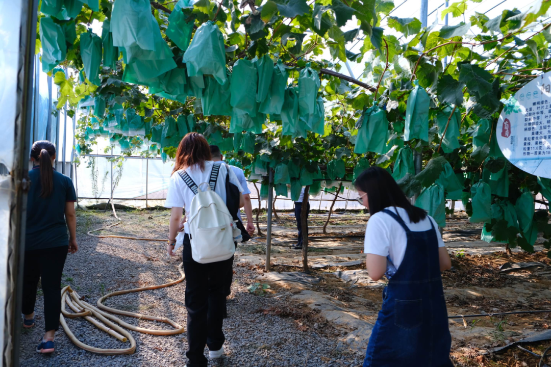 接下来,实践团赴云牧果业葡萄种植基地进行调研考察。干净明亮的大棚内,一串串品种各异,晶莹剔透的葡萄悬挂在枝头。据负责人王胜一介绍,黄龙汪村一带原本是贫困村,产业结构单一,经济基础薄弱。在2017年,黄龙汪村率先实行产业扶贫项目,以党建引领产业发展,书记王绪和经过多方考察后决定发展葡萄种植业,并在全村率先种植葡萄,在看到成效后引领全村大力发展葡萄种植产业,并得到镇政府扶持,成为街道重点扶贫项目。目前,云牧基地建有葡萄大棚11个,共投入扶贫资金80余万元。2016年以来,先后引进阳光玫瑰、金秋红蜜等优良品种十多个,亩产葡萄2000公斤左右。