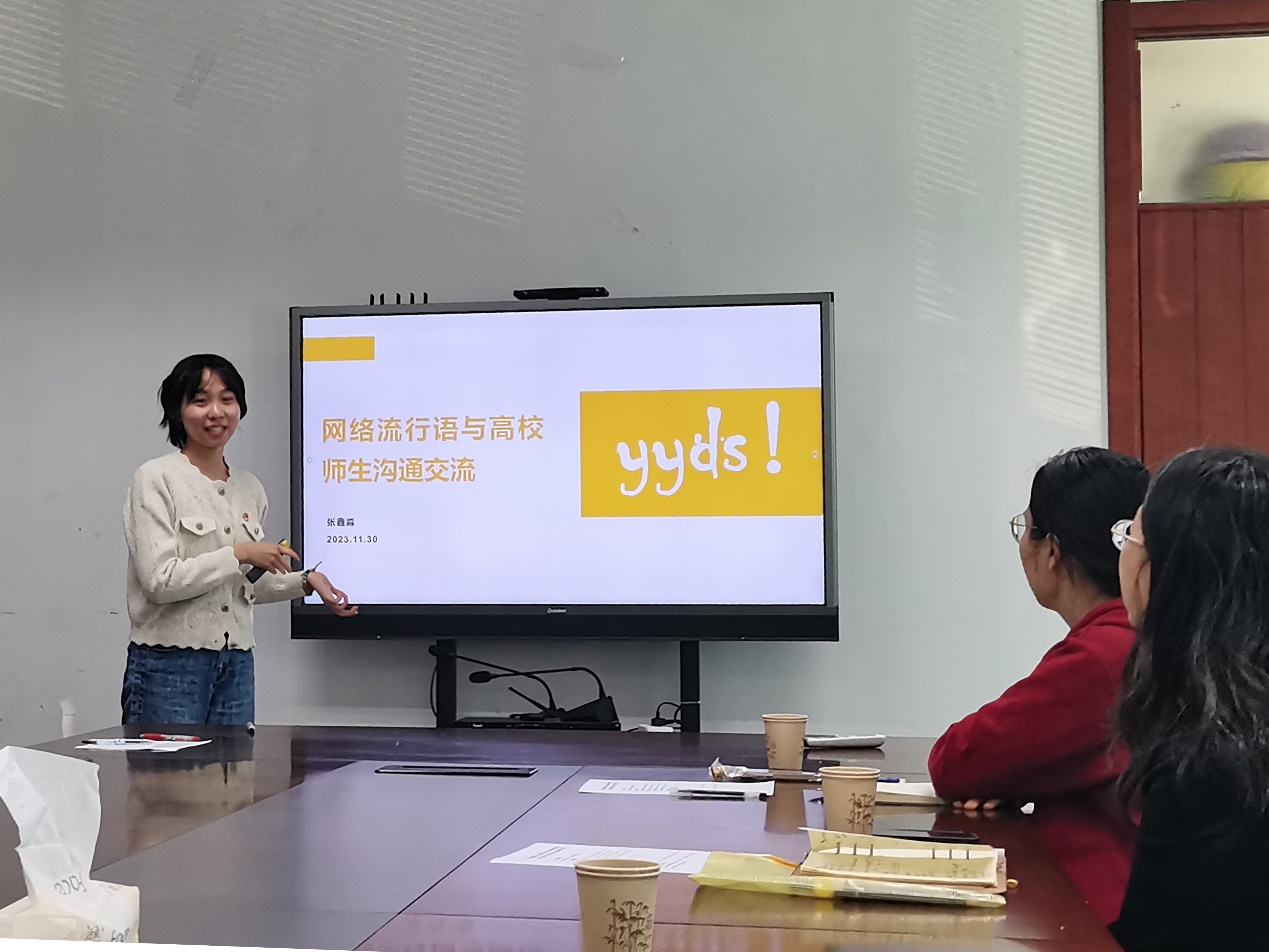 威廉williamhill2023级硕士生党支部党员代表张鑫淼,围绕《网络流行语与师生沟通交流》一题进行了分享。她细致介绍了网络流行语的发展过程、流行规律、传播特点,并结合社会现象和热点,向师生党员科普了近期流行的网络热词和延伸含义。张鑫淼结合主流媒体的经典案例,对当下师生在沟通交流中应当如何跨越媒介使用的代际差异,提出了可以将网络流行语和学生教育进行结合,进而丰富教育手段,拉近师生距离的建议。