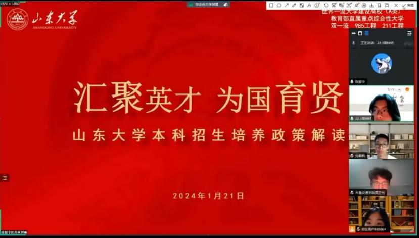 1月20日晚,团队成员集中开展线上模拟宣讲,每个同学都拿出十二分的认真,轮流进行模拟宣讲,并由其他成员进行提问,随后总结问题,争取模拟最真实的宣讲环境。此次模拟宣讲不仅缓解了同学们的紧张情绪,而且完善了具体的宣讲流程。其他成员的提问也为宣讲同学提供了更具体的思路。同时,团队成员做到了将山大宣讲与高中学弟学妹的学习生活结合在一起,不仅能生动有趣地讲解关于山大的知识,还能利用自己的经验为学弟学妹的学习生活排忧解难。