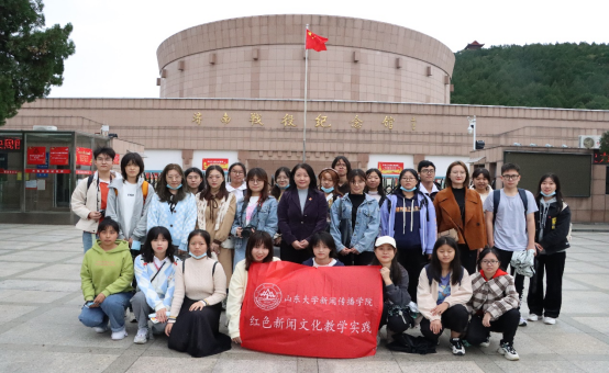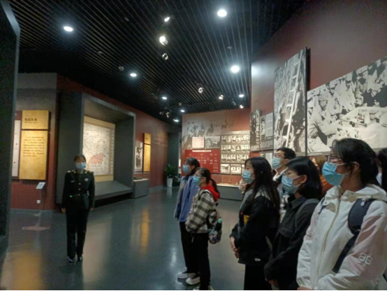 20级新闻专业的本科生在副院长、红色新闻文化系列课程负责人邱凌的带领下步入济南战役纪念馆大厅,馆内气氛庄严肃穆,陈列着大量济南战役相关的革命史料和实物。讲解员告诉大家,济南战役拉开了解放战争三大战役的序幕,在历史上具有重要地位。随着讲解员的细致讲解,同学们遨游在历史长河之中,纵览了近现代济南带有浓厚红色气息的发展历史:从慷慨激昂,无数战士抛头颅洒热血的济南战役,到人民倾其所有,“用小车一车车推出来”取得胜利的三大战役,到中华人民共和国成立后新时代济南的蓬勃发展……为有牺牲多壮志,敢教日月换新天,今日的美好家园,幸福生活,离不开无数先辈抛头颅洒热血接续不断的奋斗,离不开中国共产党的领导。参观过程中,有的同学走到馆藏史料前,垂眸沉思;有的同学拿起摄像机,拍摄采访;有的同学相互交流讨论,分享心得体会……馆内苍松翠柏映着同学们青春洋溢的身影,红色精神的种子不知不觉间在大家的心底萌发。