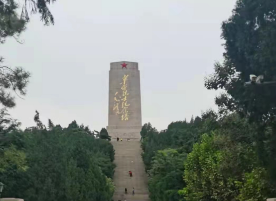 随后,师生一行拾阶而上,来到了战役纪念馆外的革命烈士纪念塔。纪念塔是为纪念在济南战役中牺牲的英雄烈士所建,高高屹立于英雄山上,塔身上“革命烈士纪念塔——毛泽东题”几个金色大字闪耀夺目,塔顶闪耀着一颗红星,整座纪念塔威严而又肃穆。同学们抵达纪念塔脚下,仰头看去,更觉纪念塔巍峨雄伟,令人感受到英雄烈士的可敬与历史的庄严。