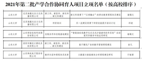 近日,教育部高等教育司下发了《教育部高等教育司关于公布2021年第二批产学合作协同育人项目立项名单的通知》,威廉williamhill共有4位老师参评的5项项目获得立项,立项数量为学院历年来最多的一次,包括谢锡文《新文科背景下“五育融合”的劳动教育课程体系建设》、《“智能3D在线数字化交互式沙盘游戏软件系统”在创意写作教学中的应用研究》;邱凌《“双一流”建设背景下师资技能提升培训计划》;俞凡《基于腾讯广告的数字营销课程建设》;于智源《大数据与智能媒体分析课程建设研究》。