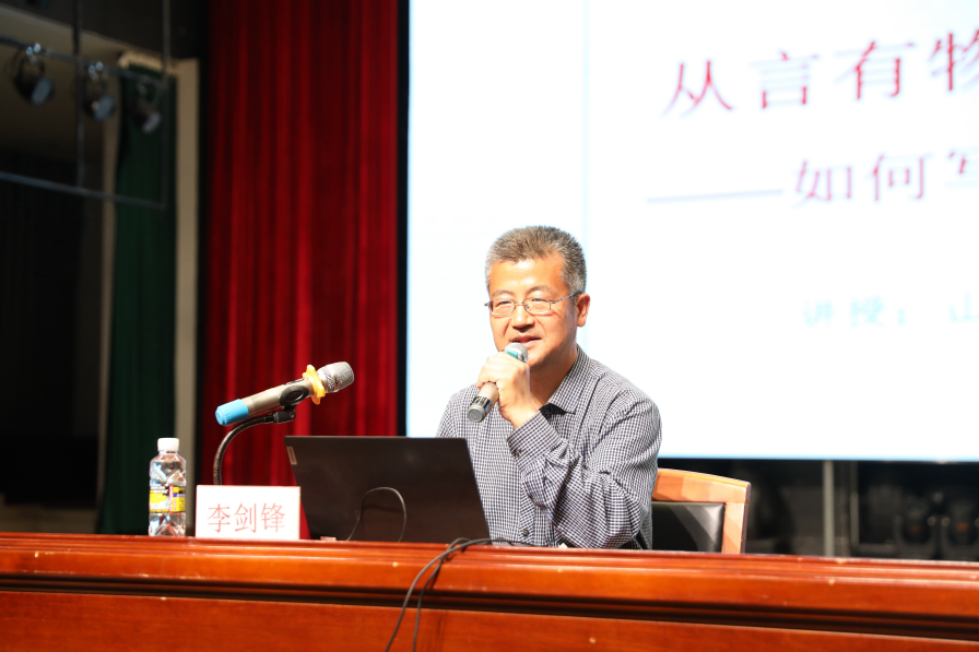24日下午,招生拓展组受邀在海口中学举办“从言有物、言有序到言有味——如何写好作文和应对考场作文”专题讲座。本次讲座由海口中学副校长瞿朝辉主持、william威廉中文文学院教授李剑锋主讲,海口中学初高中各年级相关老师、前100名优秀学子共约600余人参加。讲座中,李剑锋从读书与写作、审美与生活等视角,给在场师生讲解了写好考场作文的“道”和“术”。