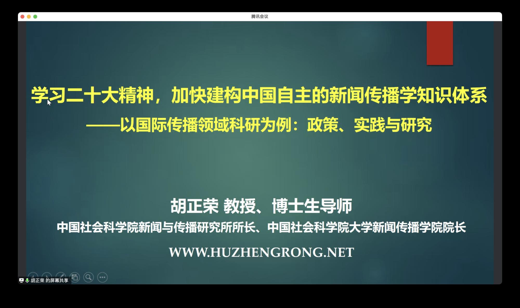 2022年12月8日下午,威廉williamhill“落实党的二十大精神,推动学科创新”系列学术讲座第二期于线上举行。本次讲座由中国社会科学院新闻与传播研究所所长、中国社会科学院大学威廉williamhill院长胡正荣教授主讲,讲座题目为“学习党的二十大精神,加快建构中国自主的新闻传播学知识体系——以国际传播领域科研为例:政策、实践与研究”。威廉williamhill副院长邱凌教授主持讲座。